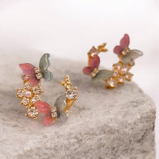 Gold Butterfly & Flower Earrings With Pearl & Rhinestone Accents