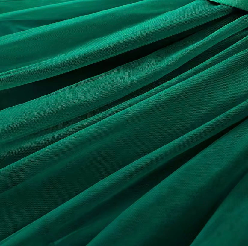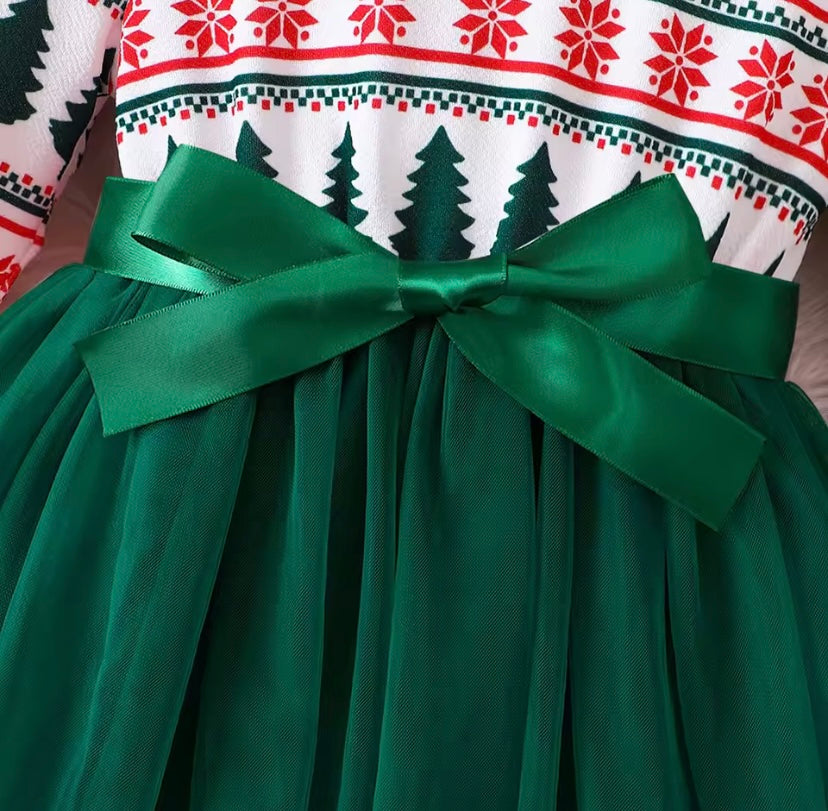 Adorable festive girl’s dress - toddler/preschool. Features a colorful holiday elk print top and a green tulle skirt. Cute ruffles on sleeves and a bow tie. Perfect for holiday celebrations.