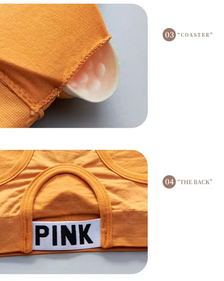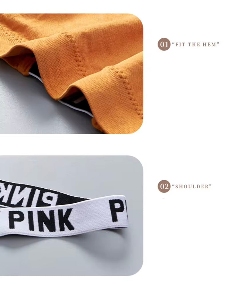 Women's Sports Bra. Black with white letters “PINK”. Stretchy for comfort. Wide shoulder straps.